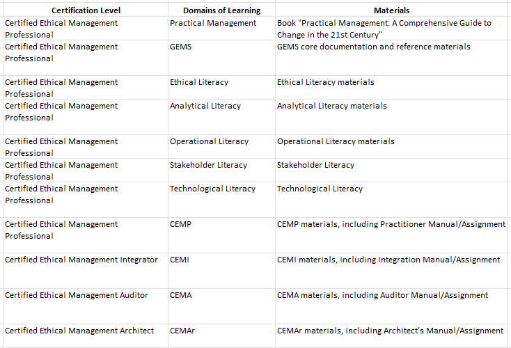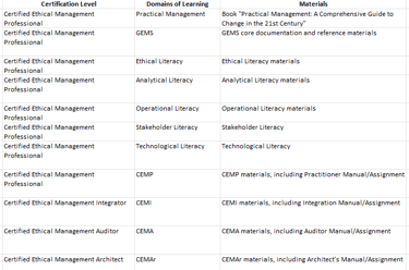 Each certification level (CEMP, CEMI, CEMA, CEMAr) provides a verifiable qualification backed by GEMS — ensuring that certified professionals demonstrate measurable competence in ethical and managerial literacy.